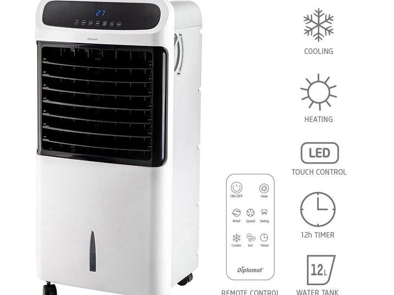 Охладител и отоплител 5в1 3 степени на въздушната струя в режим „Охлаждане“ 2 степени на отопление - 1000/2000W Функция „Охлаждане“ и „Отопление“ Овлажнител Йонизатор Пречистване на въздуха Функция „Осцилация“ с голям ъгъл на завъртане 12-часов таймер Дистанционно управление LED контролен панел Обем на резервоара – 12 л Максимален дебит – 450 м3/ч Ниско ниво на шум: 65 dB (A) Включен охлаждащ блок Кол...