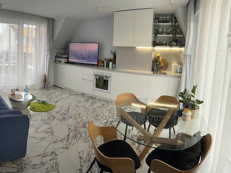 Висок клас електроуреди, кухня Лорита с плот и гръб от технически камък. Подовата настилка на целия апартамент е испански гранитогрес, имитация на мрамор, а едната тераса е с декинг. Две големи тераси с място за забавление и релакс. Два климатика General Electric, с изключително ниски сметки. 7 см изолация на тавана. Има гардероб до спалнята, което добавя допълнителен комфорт и практичност - рядко предимство в този тип имоти.